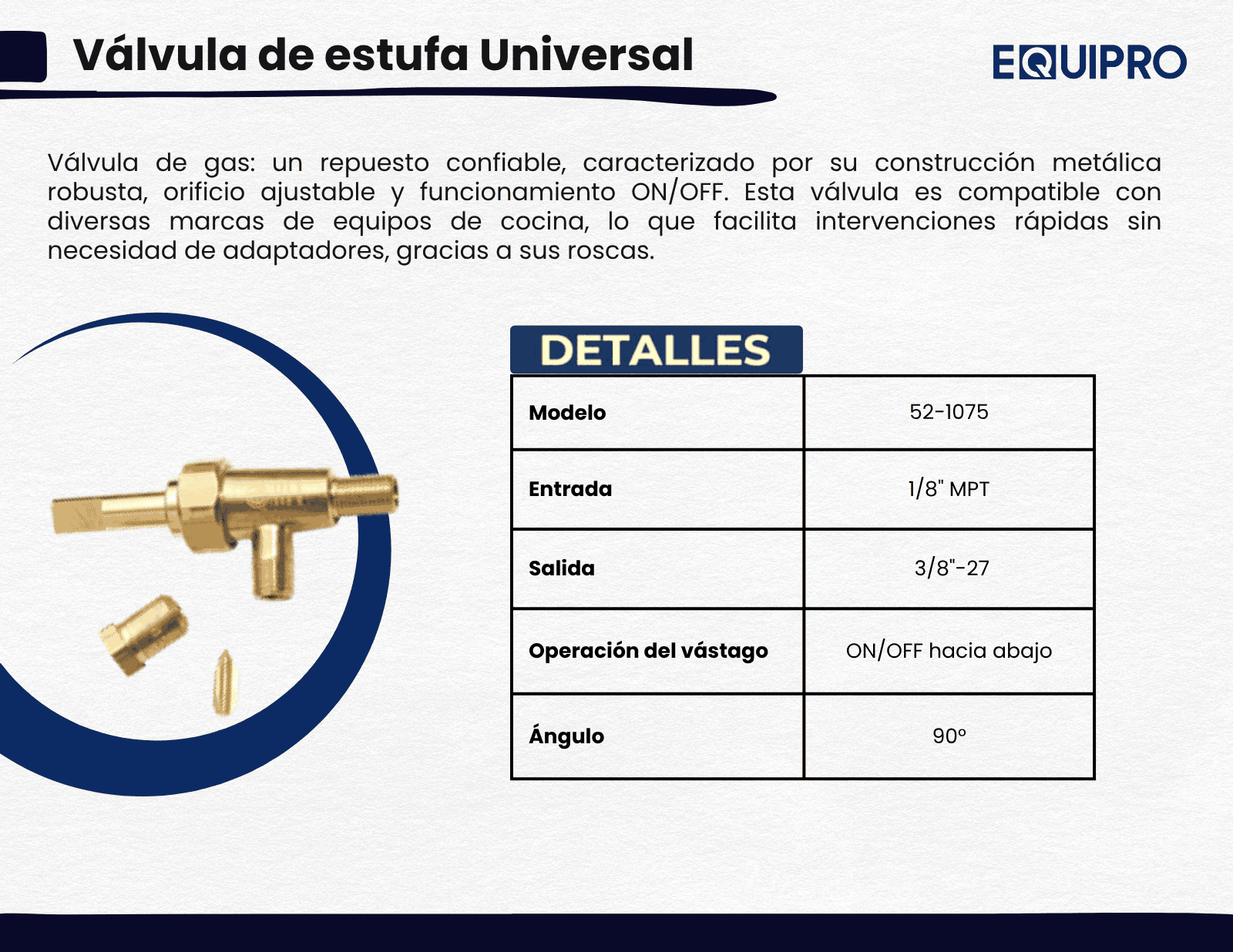 Válvula de gas para equipos de cocción comercial con entrada 1/8" MPT y salida 3/8"-27. Incorpora orificio #40 ajustable para controlar el caudal y utiliza un vástago en posición inferior (rotación ON/OFF). Construcción robusta para servicio en cocina profesional.