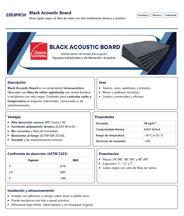 Aislamiento termo-acústico fabricado con fibra de vidrio aglutinada y resina fenólica de fraguado térmico, presentado en placas de alta densidad de color negro cubiertas con un velo negro de fibra de vidrio. Medidas 1.22 m de alto X 0.61 M de ancho. Tiene un espesor de 2.5 cm Alcanzando a cubrir un área de 0.74m cuadrados por placa. Este material se distribuye por paquetes donde cada paquete contiene 20 placas (alcanzando a cubrir 14.88 m cuadrados. Reduce el 70% del ruido.