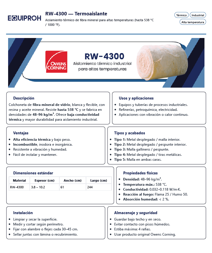 Son colchas termoaislantes de fibra mineral de vidrio en color blanco, fabricadas a partir de arena sílice lubricadas con aceite mineral para protegerlas contra la abrasión; desarrolladas para soportar temperaturas de hasta 538°C (1000°F). Se vende por rollos, cada rollo mide 2.5 cm x 1.22 m de ancho x 15.24 m de largo y densidad de 96kg/m3 Uso industrial: Generación eléctrica, petroquímica básica y secundaria, refinación de petróleo y en la industria química, sucroquímica y naviera. Son el aislante ideal para tuberías y equipos industriales que operan a temperaturas de hasta 538 °C (1000 °F). se adaptan a superficies irregulares de equipos y tuberías de proceso.
