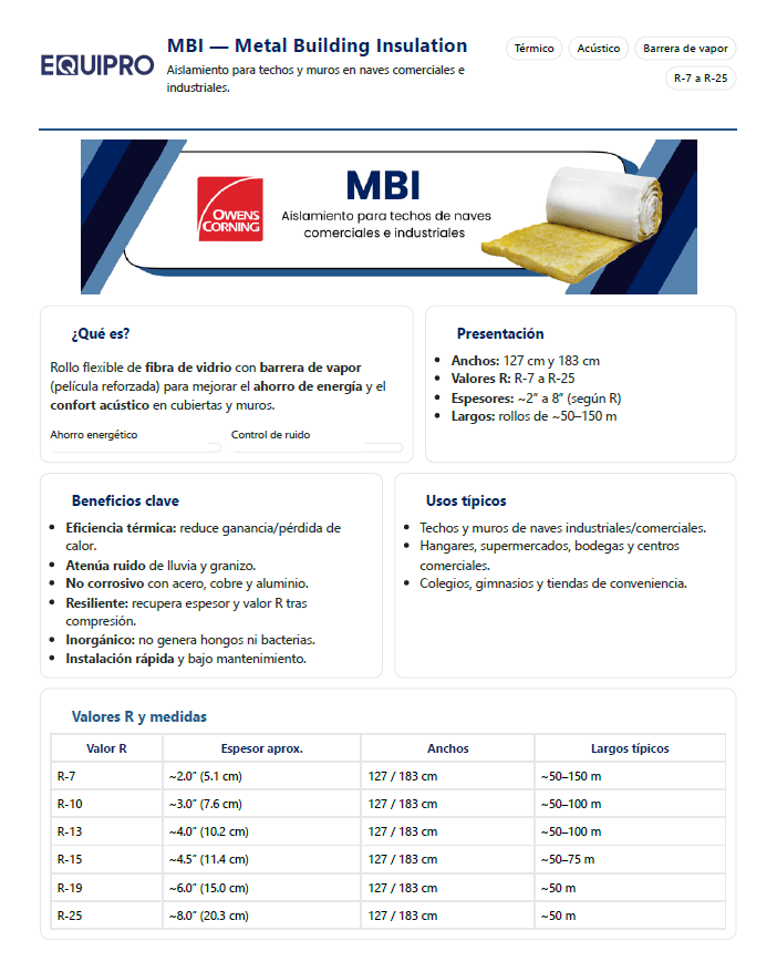 Rollo flexible de aislamiento térmico, fabricado con fibras de vidrio aglutinadas con resinas termofijas recubiertas con una barrera de vapor (vinil satinado o polipropileno reforzado) en una de sus caras. Este aislamiento térmico representa una solución altamente eficiente, segura y económica, ideal para techos muros de naves industriales y comerciales para hangares, supermercados, bodegas, centros comerciales, centros de distribución, colegios, gimnasios, tiendas de conveniencia, etc. Este aislante cuenta con las siguientes medidas: 1.83m X 15.24 m alcanzando a cubrir un área de 27.88m cuadrados Tiene un espesor de 7.6 cm . Promedio de 85% de absorción acústica.