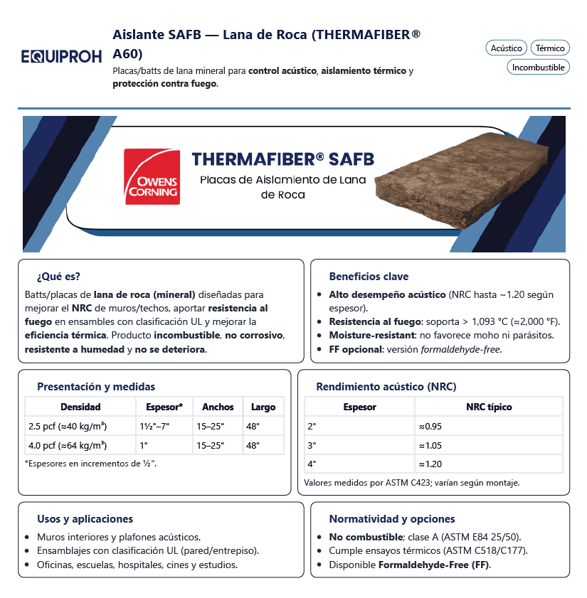 SAFB™ de Thermafiber® son placas de aislamiento de lana mineral diseñadas para proporcionar control acústico, rendimiento térmico y protección contra incendios en los diferentes muros, suelos y techos cortafuego autorizados por UL. Las placas SAFB™ resisten temperaturas superiores a 2.000ºF (1,093° C). Posee una densidad de 2.5 pcf (Libra por pie cubico). Posee un NRC de 0.95, disminuye aproximadamente 95% su nivel acústico. El aislante SAFB, cuenta con las siguientes medidas: 0.61m de ancho y 1.22m de largo. Este material se distribuye por paquetes, donde cada paquete contiene un total de 12 placas. Cada placa puede cubrir un área cuadrada de 0.74m2, por lo que obtenemos que cada paquete alcanza a cubrir un área total de 8.93m2.