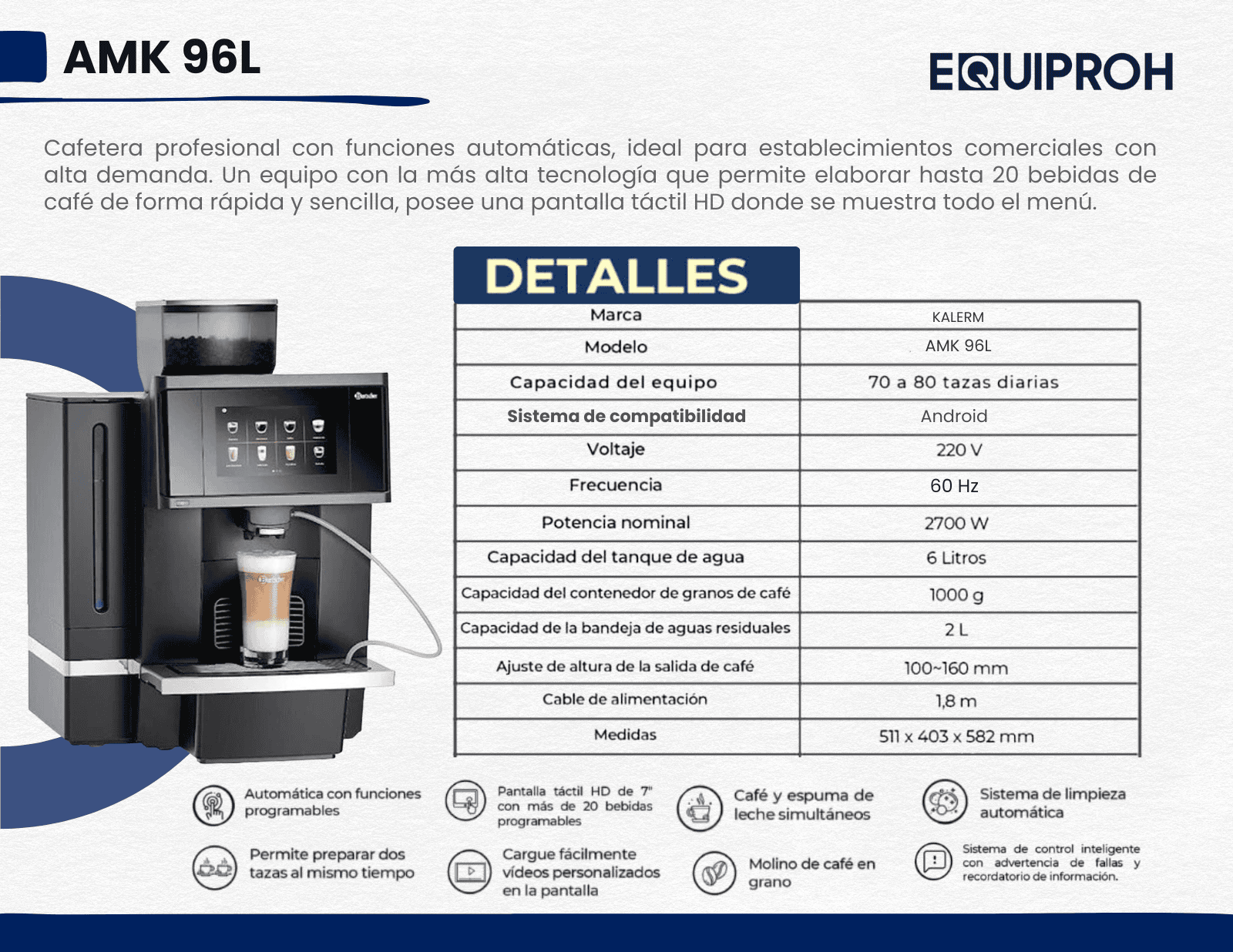 La cafetera profesional AMK 96L es un equipo avanzado y automatizado •Elabora hasta 20 bebidas de café diferentes de forma rápida y eficiente, incluyendo café y espuma de leche simultáneamente. •Su pantalla táctil HD de 7" facilita la selección y personalización de las bebidas •Sistema Android •Capacidad 80 - 90 tazas diarias •Ideal para cafeterías, gasolineras, hoteles y restaurantes. •Sistema de limpieza automática y control inteligente •Mantenimiento sencillo •Rendimiento óptimo en entornos de alto tráfico. •220V