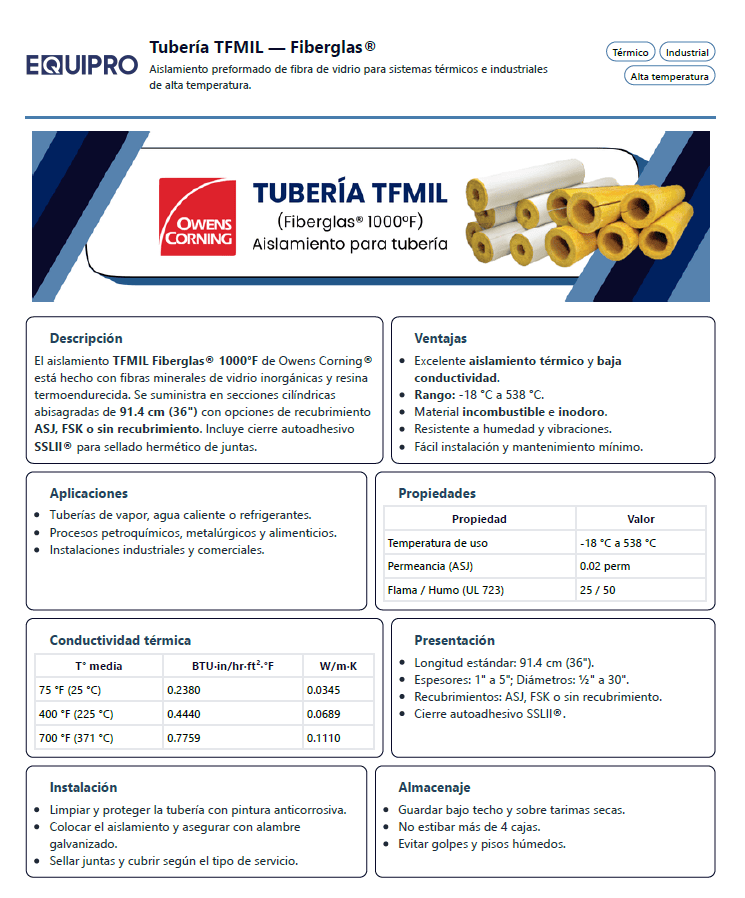 Tubería TFMIL están fabricados con fibras minerales de vidrio diseñado para operar en procesos con rangos de temperatura de -18°C (0°F) a 538°C (1000°F). Son aislamientos térmicos ideales para tuberías de proceso y servicio que conducen vapor, agua caliente, agua helada, refrigerantes y gases. Medidas: m de largo 0.91 Espesor: 1" Diámetro que cubre 3" de diámetro