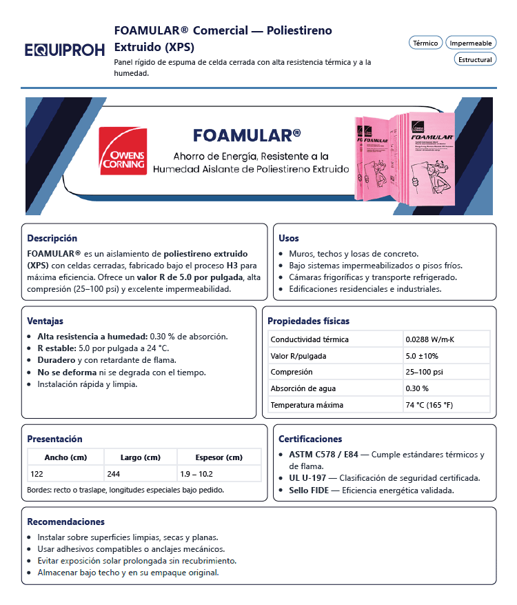 Paneles de 48”x96” de diferentes espesores, flexibles y ligeros. Es un aislamiento térmico de espuma rígida de poliestireno extruido que gracias a su diseño de celdas cerradas es prácticamente impermeable, es liviano, pero dependiendo de su presentación puede resistir entre 25 y 60 lb por pulgada cuadrada.