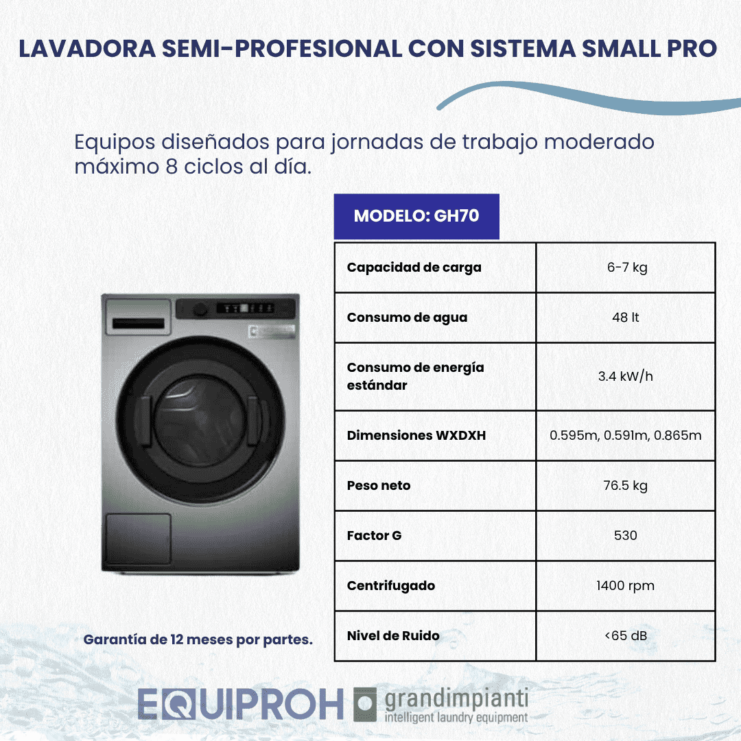 Lavadora profesional de alta velocidad, ideal para baja capacidad de lavado. Tanque y tambor construido en acero inoxidable. *Reducción del 30% del tiempo de lavado y costes de funcionamiento. *10 programas disponibles para lavado *3 programas disponibles para personalización. *Capacidad: 6-7Kg *Consumo eléctrico: 3.4Kw *Consumo de agua: 48lt *Centrifugado : 1400 rpm *Dimensiones LxDxH: 595x591x865mm *Peso neto: 79.7Kg