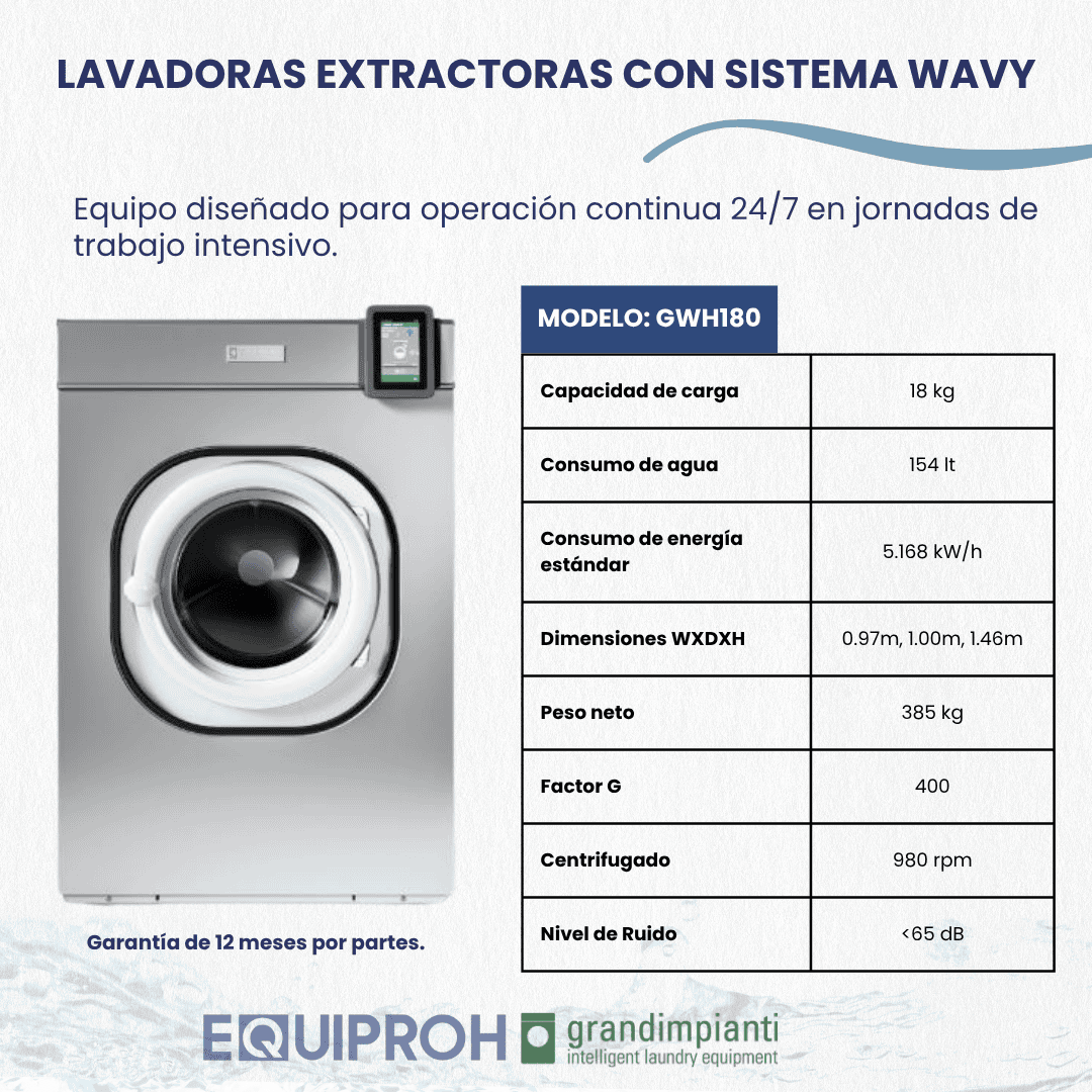 Lavadora con alta velocidad de centrifugado. Características: -No necesita anclaje a piso, cuenta con amortiguadores -Capacidad de carga: 18 kg Consumo eléctrico estándar: 5.16 kWh Consumo de agua 100% de capacidad 154lt Volumen del tambor: 0.18m3 Velocidad de centrifugación 980rpm Porcentaje de húmeda final 43% Control inteligente WAVY con numero infinitos de programas editables para la creación de ciclos una interfaz simple, moderna e interactiva. -Dispensador de 4 compartimientos ubicados de forma ergonómica para colocar de forma manual químicos de preferencia (detergente, suavizante, cloro, entre otros) -Potente motor capaz de generar hasta 400G de fuerza centrífuga -Sistema de pesaje (WDS) patentado para pesar de forma automática la ropa y regular los consumos como agua, energía y químicos. Medidas LxDxH: 970x 1000 x1460 mm Peso neto: 385kg