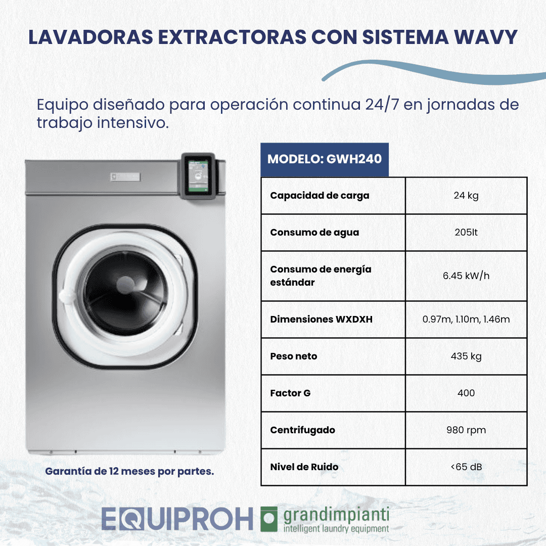 Lavadora con alta velocidad de centrifugado. Características: -No necesita anclaje a piso, cuenta con amortiguadores -Capacidad de carga 24 Kg Consumo eléctrico estándar: 6.54kWh -Tensión eléctrica: 230V/60Hz Consumo de agua 100% de capacidad 205.3lt Volumen del tambor: 0.24 m3 Velocidad de centrifugación 980rpm Porcentaje de húmeda final 43% -Dispensador de 4 compartimientos ubicados de forma ergonómica para colocar de forma manual químicos de preferencia (detergente, suavizante, cloro, entre otros) -Control inteligente WAVY con numero infinitos de programas editables para la creación de ciclos una interfaz simple, moderna e interactiva. -Potente motor capaz de generar hasta 400G de fuerza centrífuga -Sistema de pesaje (WDS) patentado para pesar de forma automática la ropa y regular los consumos como agua, energía y químicos. -Medidas LxDxH: 970x1105x1460mm -Peso neto: 435 kg