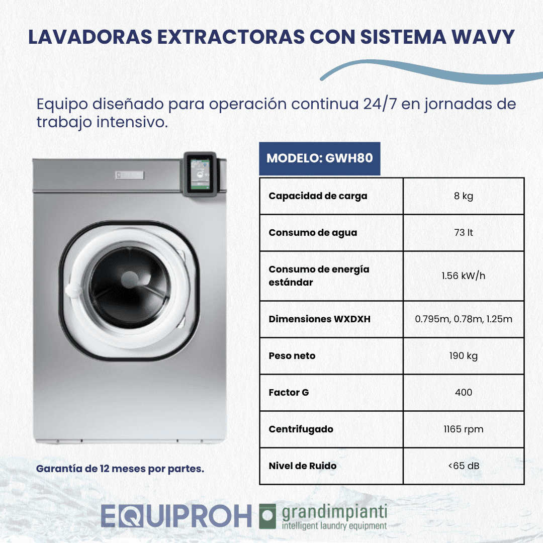 Lavadora industrial de alta centrifugación Características: No necesita anclaje a piso, cuenta con amortiguadores Capacidad 8kg Tensión eléctrica 230V 60Hz Consumo energético 1.56KWh -Volumen del tambor: 0.75 m3 Consumo de agua 100% de capacidad 71.1lt Velocidad de centrifugación 1165rpm Porcentaje de húmeda final 43% Control inteligente WAVY con numero infinitos de programas editables para la creación de ciclos una interfaz simple, moderna e interactiva. -Potente motor capaz de generar hasta 400G de fuerza centrífuga -Sistema de pesaje (WDS) patentado para pesar de forma automática la ropa y regular los consumos como agua, energia y químicos. Medidas LxDxH: 795x780x1245 mm Peso neto: 190 kg