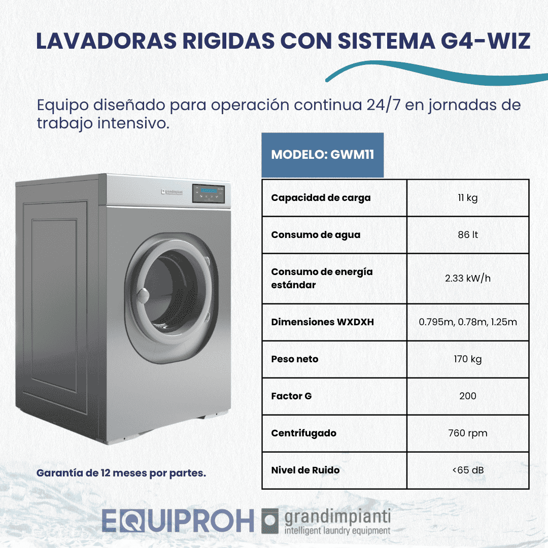 *Lavadora industrial de mediana centrifugación Anclada a piso Capacidad 11kg Tensión eléctrica 230V 60Hz Consumo energético 2.33KWh Consumo de agua 100% de capacidad 85.9lt Velocidad de centrifugación 760rpm Porcentaje de húmeda final 70% Control G4-Wiz análogo con 20 programas editables para la creación de ciclos Memoria de uso Cuenta con cuatro compartimientos para agregar productos químicos Medidas LxDxH: 795x780x1245 mm Peso neto: 170 kg
