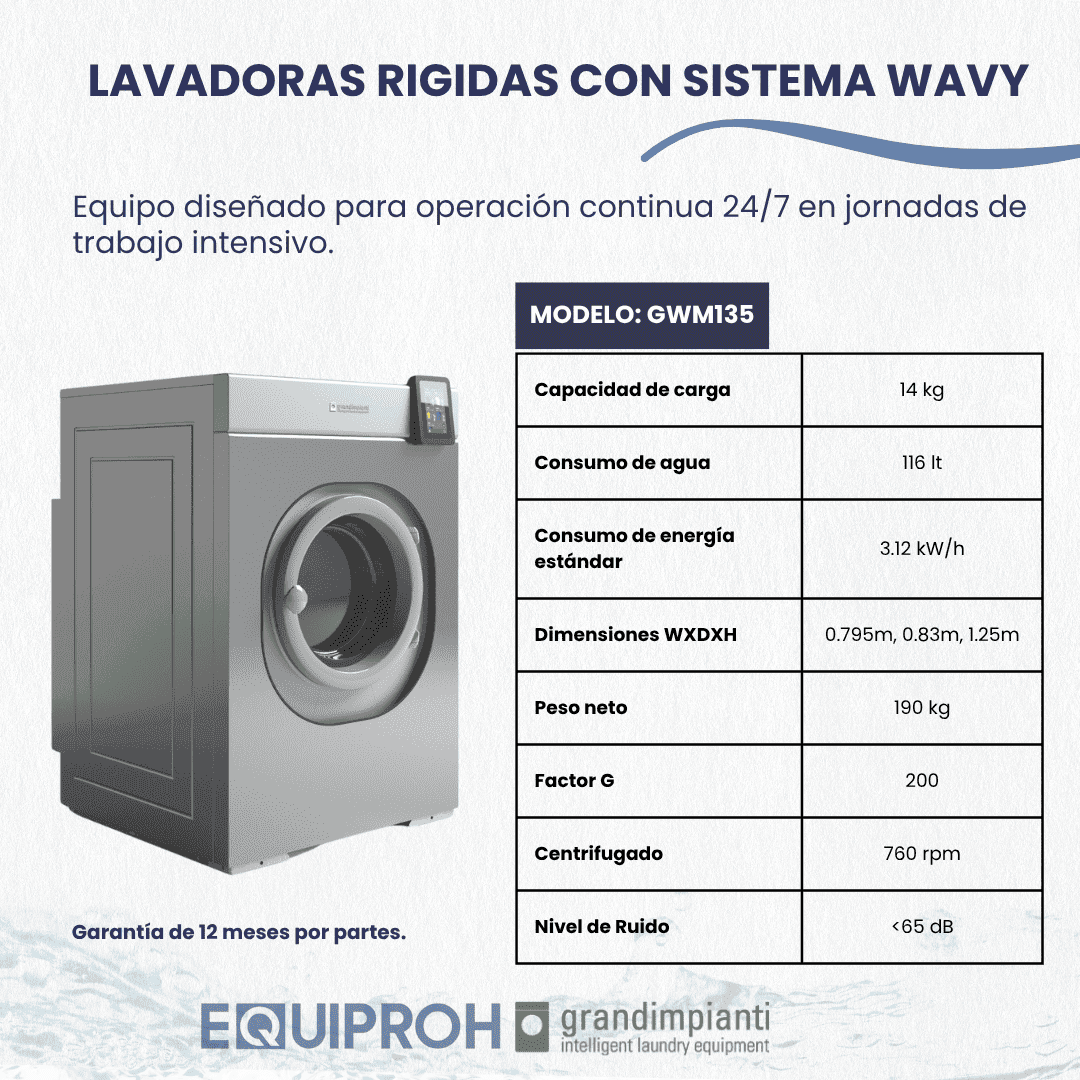 Lavadora con baja y media centrifugación. Lavado rápido y eficaz, aseguran un reducido porcentaje de humedad residual y, por tanto, un elevado ahorro en los procesos posteriores de secado y planchado. Equipadas con un tambor de acero inoxidable con una estructura especial de semiesfera que evita que la fricción dañe las prendas. Estas máquinas pueden lavar tanto un traje de negocios como un vestido de novia. Características: -Capacidad: 14 kg -Dispensador de 4 compartimientos ubicados de forma ergonómica para colocar de forma manual químicos de preferencia (detergente, suavizante, cloro, entre otros) -3 entradas para agua: caliente, fría fuerte, fría suave -Potente motor capaz de generar hasta 200G de fuerza centrífuga -Sistema de pesaje (WDS) patentado para pesar de forma automática la ropa y regular los consumos como agua, energía y químicos. -Control Wavy: interfaz sencilla e intuitiva que se adapta a las necesidades del usuario. Pantalla de 7" siempre visible y fácil de usar con guantes -Programas ilimitados de lavado -Apertura del tambor 180° lo que permite facilitar el proceso de carga y descarga -Tubería de agua ¾ -Válvula de vaciado de 3" -LxDxH: 795 x 935 x 1245 mm -Volumen del támbor: 0.135 m3 -Tensión electrica: 230V/60Hz -consumo eléctrico estándar: 3.12kW/h