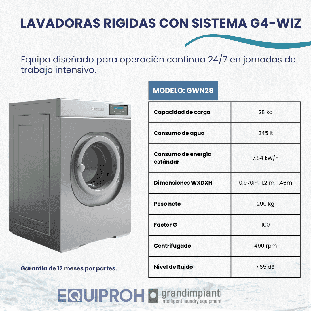 La GWN28 es una lavadora industrial de normal velocidad de centrifugado. Diseño robusto y confiable para uso industrial intensivo con alto rendimiento y eficiencia. Eficiencia y tecnología avanzada para su negocio. Características: -Capacidad de carga: 28 Kg -Motor capaz de generar hasta 100G de fuerza centrífuga. Velocidad de 490 RPM -Sistema de pesaje (DWS) para optimizar consumo de agua y detergente según carga. -Dispensador de 4 compartimientos ubicados de forma ergonómica para colocar de forma manual químicos de preferencia (detergente, suavizante, cloro, entre otros) -3 entradas para agua: caliente, fría fuerte, fría suave -Control G4-WIZ® con 20 programas de libre ajuste. -Apertura del tambor 180° lo que permite facilitar el proceso de carga y descarga. -Tubería de agua ¾ -Válvula de vaciado de 3" -Medidas LxDxH: 970x1210x1460 mm Volumen del tambor 0.28 m3 Tensión eléctrica: Voltaje 230/3/60 Hz
