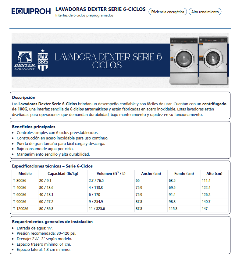Modelo: T-400 INDUSTRIAL • 6 ciclos programables. • Puertas de cromo pulido, la tina, el cilindro y el panel posterior, inferior y los laterales de acero inoxidable AISI 304 hacen que las lavadoras se mantengan en excelentes condiciones año tras año. •Sensor de presión electrónico ofrece numerosas opciones de niveles de agua para aumentar la eficiencia y el ahorro. •Inversores que reducen el consumo de energía, mejoran el desempeño y alargan la vida útil del motor. •Fuerza de centrifugación estándar de 100G remueve más agua. Capacidad en seco: 13.6Kg (30 libras) Volumen del cilindro: 113.3 L Microprocesador de 6 Ciclos Fuerza Centrifugación: 100 G Dimensiones: Altura del Gabinete 122.4 cm Ancho del Gabinete 75.9 cm Profundidad del Gabinete 69.5 cm Peso Neto 196 kg Motor: 2hp (1.5 kW) Volts / Hz / Fase: 208-240/60/1 ó 3