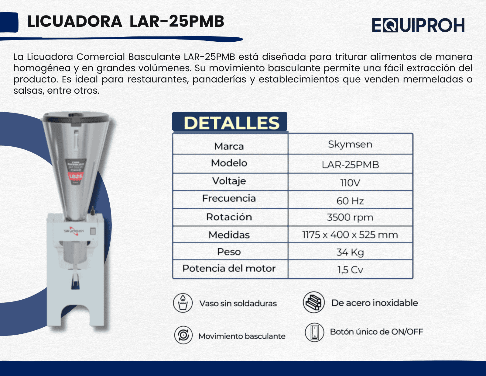 La Licuadora Comercial Basculante LAR-25PMB de Skymsen está construida en acero inoxidable, garantizando alta durabilidad y resistencia en entornos de cocina profesional. Este equipo cuenta con un potente motor de 1.5 caballos de fuerza que alcanza una velocidad de 3500 rpm, ideal para triturar grandes cantidades de alimentos de manera homogénea. Funciona con un voltaje de 110V y una frecuencia de 60 Hz. Sus dimensiones de 1175 x 400 x 525 mm y un peso de 34 kg hacen que sea robusta y estable, perfecta para tareas intensivas. Además, su diseño incluye un vaso sin soldaduras que facilita la limpieza y un sistema basculante que permite una fácil extracción de los alimentos procesados. Es ideal para restaurantes, panaderías, y la elaboración de mermeladas, salsas y otros productos que requieran mezclas en grandes volúmenes