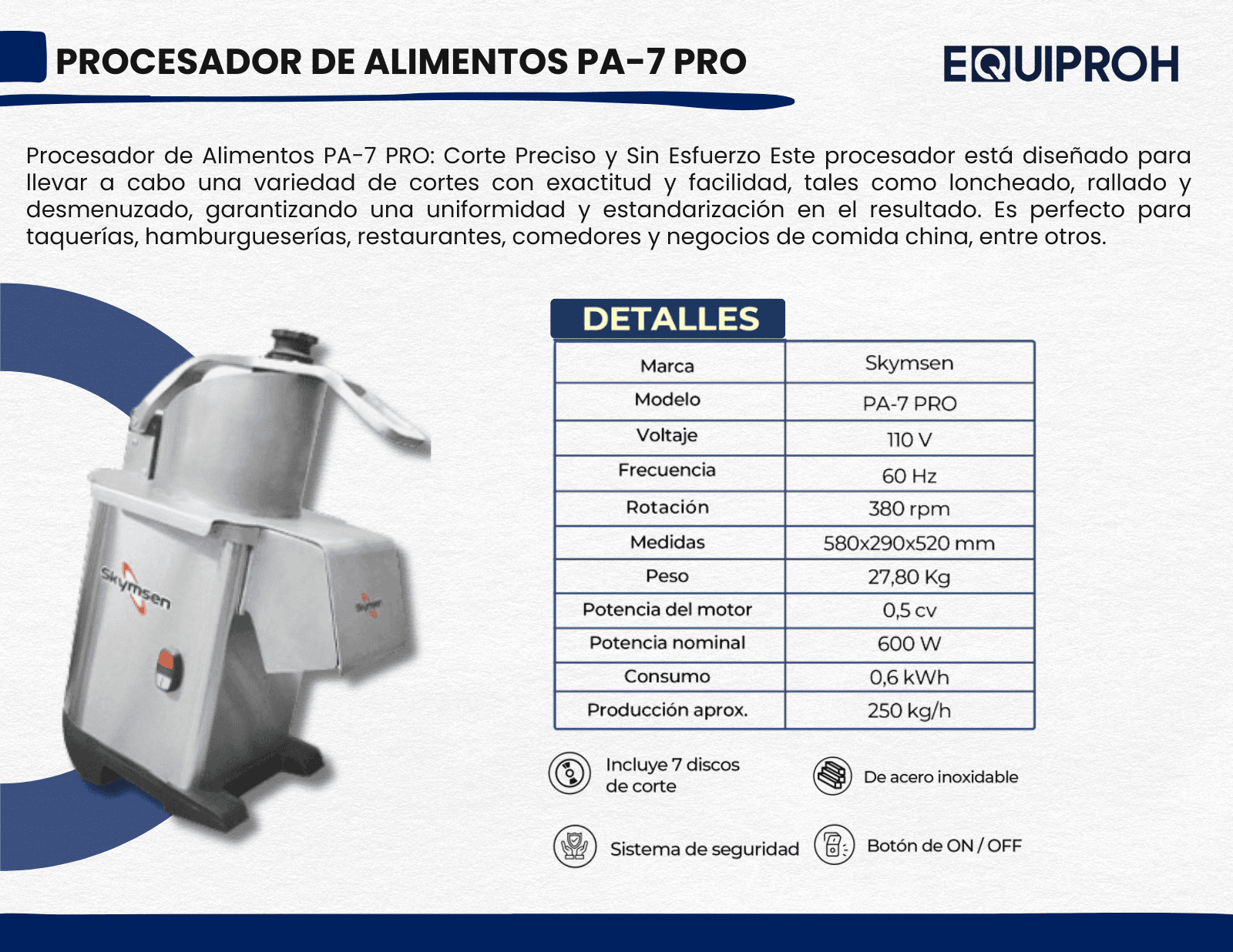 El Procesador de Alimentos PA-7 de Skymsen, fabricado en acero inoxidable, es un equipo robusto y eficiente, diseñado para realizar una variedad de cortes, incluyendo rallado, desmenuzado y otros, asegurando la uniformidad y estandarización en cada proceso. Con un motor de 0.5 caballos de fuerza y una rotación de 438 rpm, este procesador es capaz de manejar hasta 250 kg de alimentos por hora. Funciona a 110V y 60 Hz, y tiene un peso de 28.60 kg, con dimensiones de 520 x 290 x 520 mm. Incluye 7 discos de corte diferentes, lo que lo hace extremadamente versátil para su uso en taquerías, restaurantes, comedores y negocios de comida rápida. Además, cuenta con un sistema de seguridad integrado y un interruptor ON/OFF, garantizando un uso seguro y eficiente.