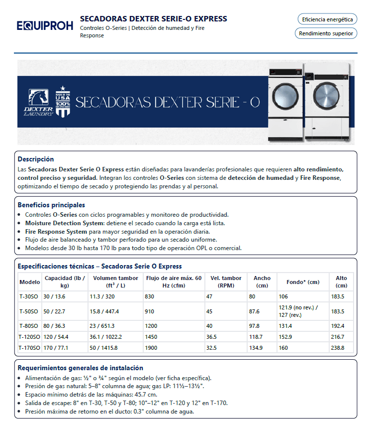 Modelo: T-170SO secadora individual Equipos de calidad fabricados con rodamientos de servicio pesado en una carcasa de hierro fundido. Los tambores perforados, el flujo de aire radial y la cantidad adecuada de recirculación de aire proporcionan máxima eficiencia. Cuenta con sistema de detecciión de humedad con tecnología de sensores inalámbricos que reduce el tiempo de secado, ahorra energía y prolonga la vida útil de la ropa. Cuenta con sistema de Respuesta contra Incendios Dexter en caso detecte un aumento inesperado de temperatura. Capacidad carga seca: 77.1 Kg (170 libras) Volumen del cilindro: 1415.8 L Dimensiones: Altura del Gabinete: 238.8 cm Ancho del Gabinete: 134.9 cm Profundidad del Gabinete: 160 cm Peso Neto 617.3 kg Motor: 2 hp (1.5 kW) 400,000 BTU/hr (117.2 Kw) Volts / Hz / Fase: 208-240 / 60 / 1