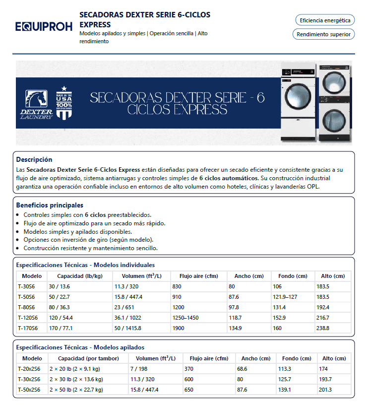 Modelo: T-170 secadora individual •6 ciclos programables •Los tambores perforados y el flujo de aire radial equilibrado proporcionan la máxima eficiencia de secado. •Equipo compuesto de puertas cromadas pulidas, los paneles de acero inoxidable de alta calidad y los tambores híbridos de acero inoxidable. Capacidad en seco: 77.1 Kg (80 libras) Volumen del cilindro: 1415.8 L Dimensiones: Altura del Gabinete 238.8 cm Ancho del Gabinete 134.9 cm Profundidad del Gabinete 160 cm Peso Neto 617.3 kg Secadora modelo a Gas: Motor (por tambor): 2&3 hp (1.5 & 2.2 kW) 400,000 BTU/hr (117.2 Kw) Volts / Hz / Fase: 208-240/60/3