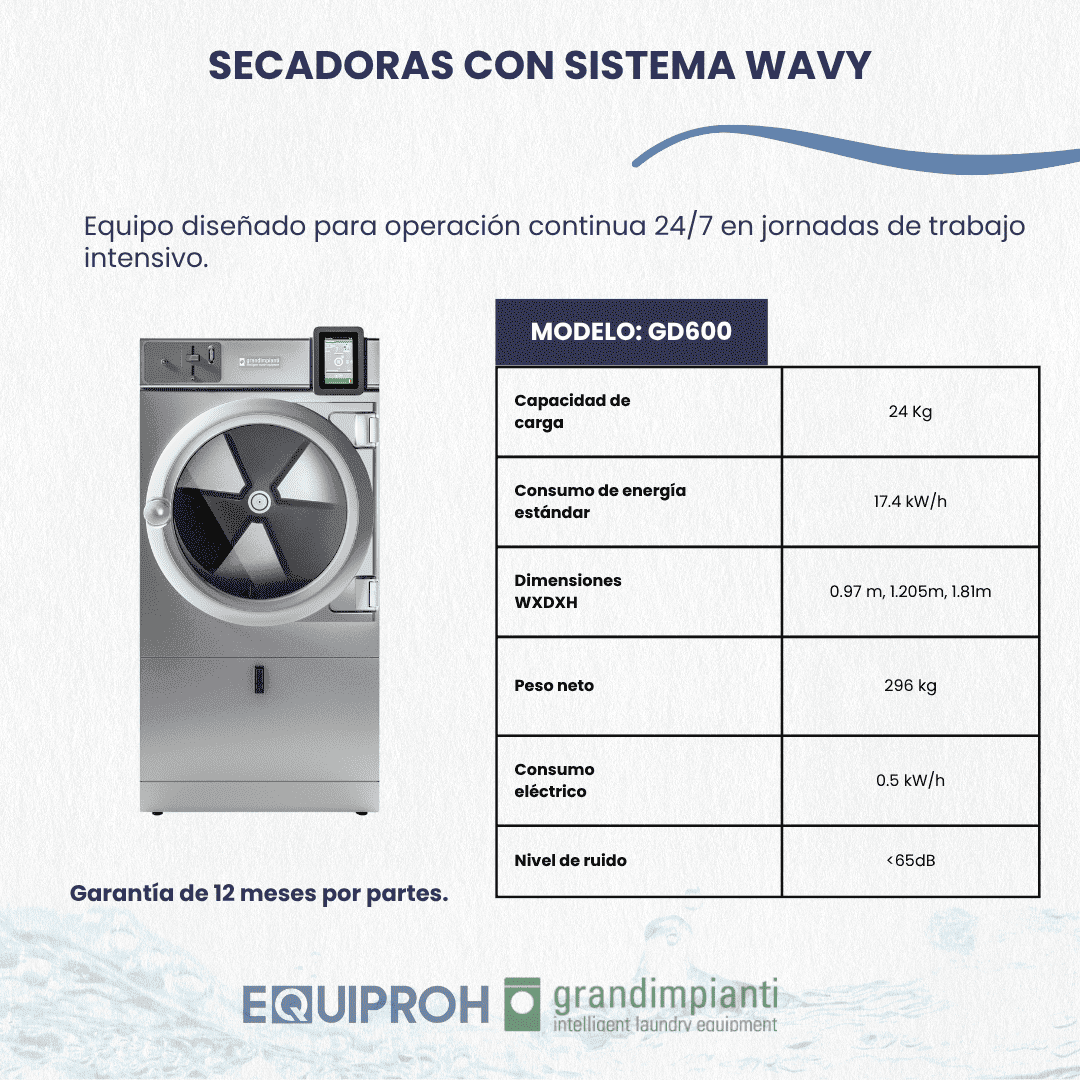 Secadora industrial eléctrica con sistema de control Wavy -Capacidad de tambor: 600dm3 -Capacidad: 24kg -Con inversor de giro en el tambor. -Tambor con recubrimiento de aluminio. -Filtro en acero inoxidable. -Número ilimitado, programas personalizados de secado. -Funcionamiento a gas -Tensión eléctrica: 230 V -Consumo eléctrico: 0.5kWh -Consumo de gas: 1m3/h Medidas LxDxH: 970x1205x1810 mm Peso neto: 306 kg