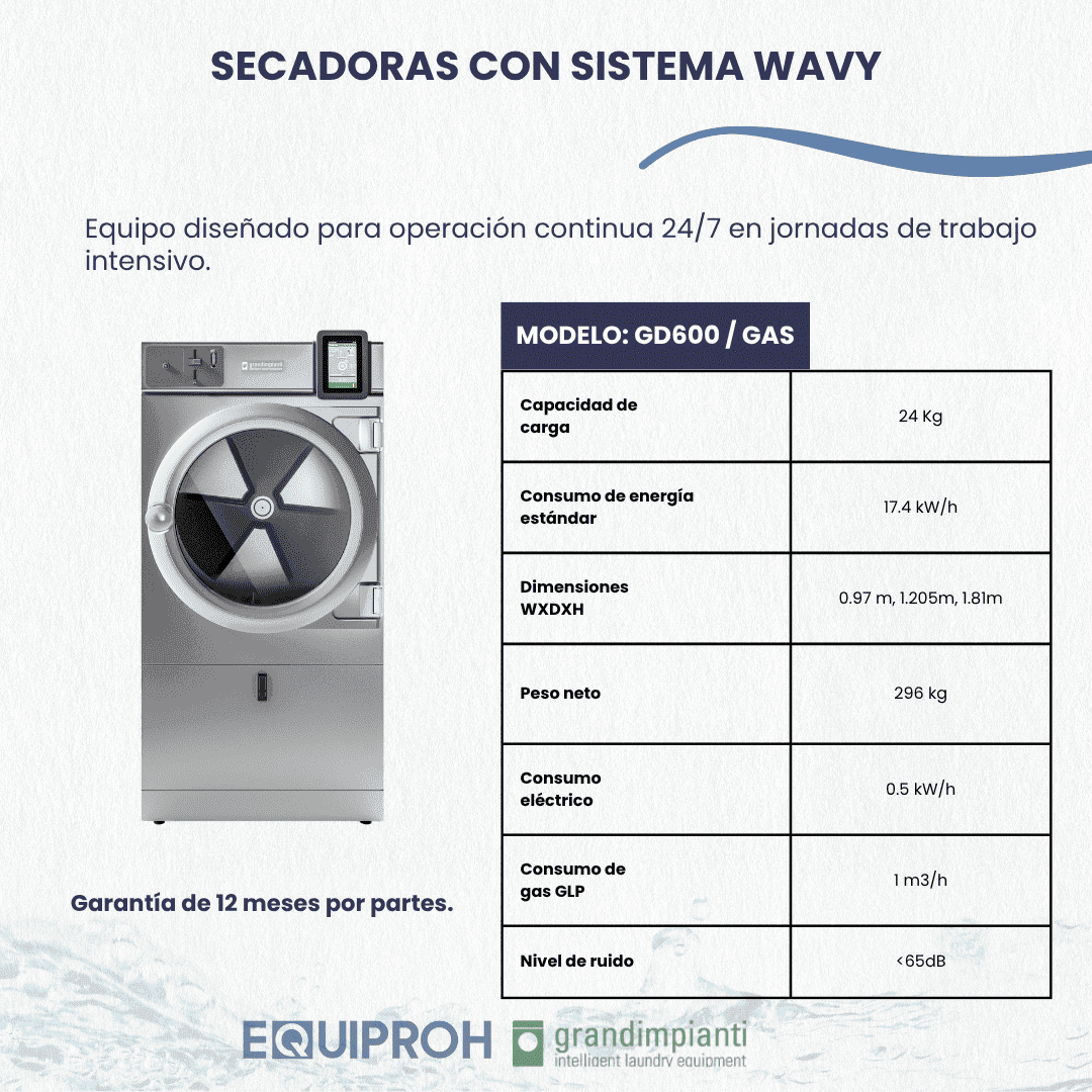 Secadora industrial a gas con sistema de control Wavy -Capacidad de tambor: 600dm3 -Capacidad: 24kg -Con inversor de giro en el tambor. -Tambor con recubrimiento de aluminio. -Filtro en acero inoxidable. -Número ilimitado, programas personalizados de secado. -Funcionamiento a gas -Tensión eléctrica: 230 V -Consumo eléctrico: 0.5kWh -Consumo de gas: 1m3/h Medidas LxDxH: 970x1205x1810 mm Peso neto: 306 kg