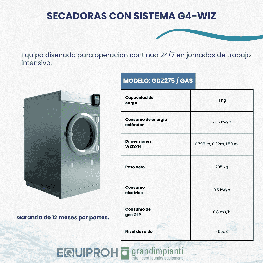 Secadora industrial a gas con sistema de control G-WIZ. Reduce el consumo gracias al aislamiento térmico. El tambor y los conductos de aire están aislados térmicamente para reducir la pérdida de calor y aprovechar al máximo el aire caliente. Diagrama de secado que permite alta capacidad de evaporación, no hay encogimiento de prendas, ausencia de fricción de entre las fibras. Características -Capacidad de tambor: 275dm3 -Capacidad: 11kg -Con inversor de giro en el tambor. -Tambor con recubrimiento de aluminio. -Filtro en acero inoxidable. -10 programas personalizados de secado. -Funcionamiento a gas. -Tensión eléctrica: 230 V -Consumo de energía:0.5 Kw -Consumo de gas GLP: 0.8 m3/h Medidas LxDxH: 795 x920 x1590 mm Peso neto: 205 Kg