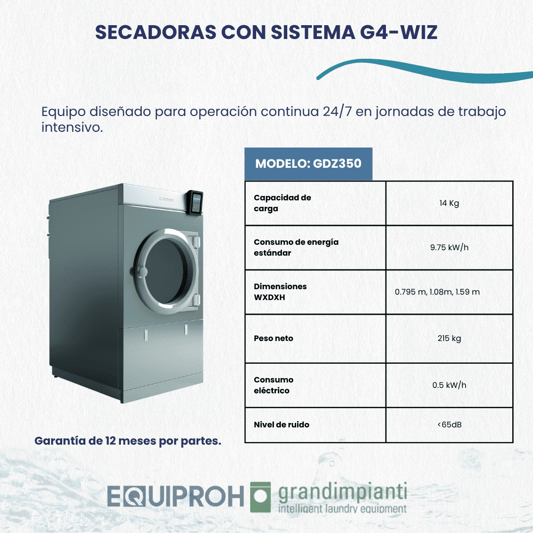 Secadora industrial eléctrica con sistema de control G-WIZ. Reduce el consumo gracias al aislamiento térmico. El tambor y los conductos de aire están aislados térmicamente para reducir la pérdida de calor y aprovechar al máximo el aire caliente. Diagrama de secado que permite alta capacidad de evaporación, no hay encogimiento de prendas, ausencia de fricción de entre las fibras. -Capacidad de tambor: 350dm3 -Capacidad: 14kg -Con inversor de giro en el tambor. -Tambor con recubrimiento de aluminio. -Filtro en acero inoxidable. -10 programas personalizados de secado. -Funcionamiento eléctrico -Tensión eléctrica: 230 V -Consumo eléctrico: 9.75 Kwh -Dimensiones LxDxH: 795x1085x1590mm -Peso neto: 215 kg