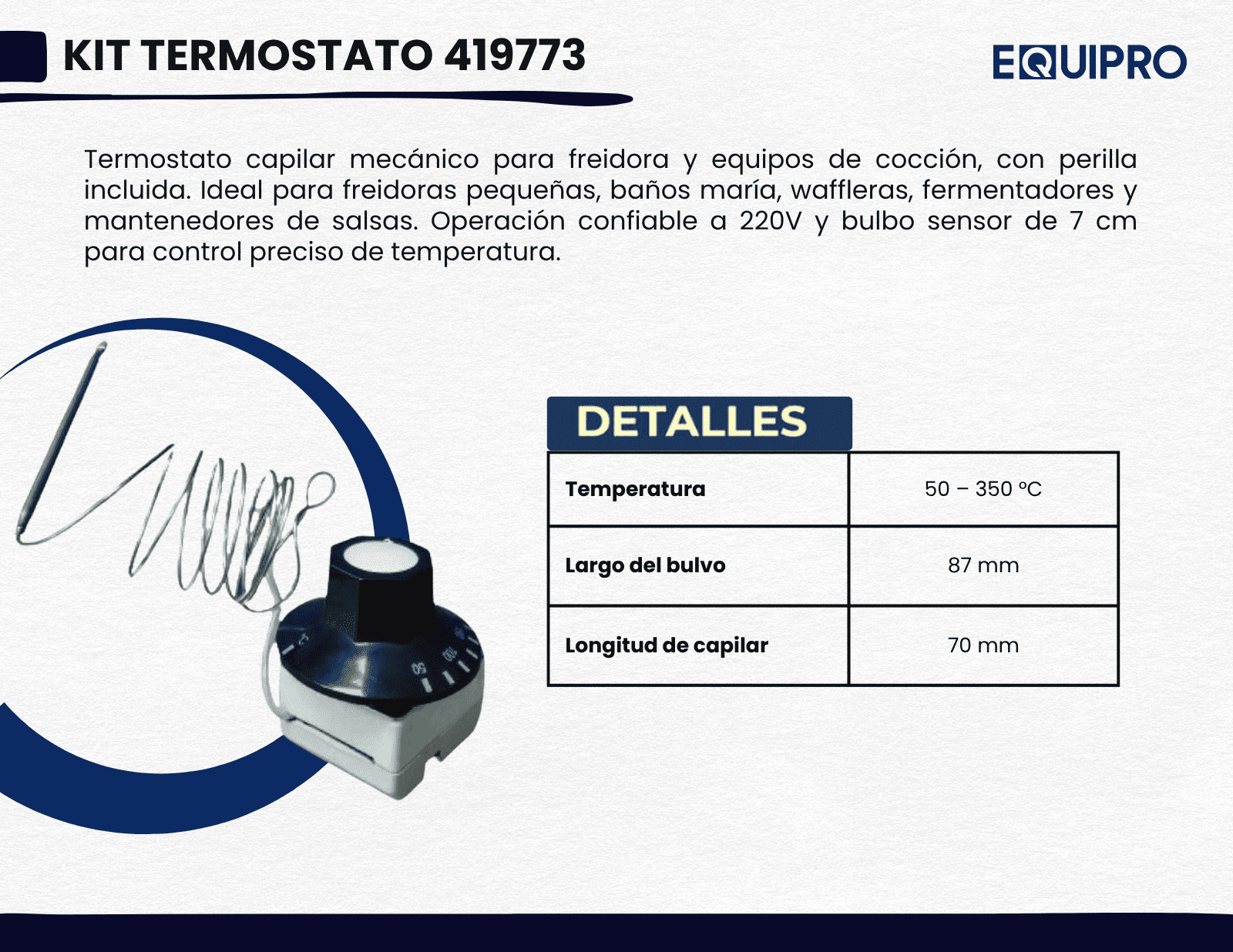 KIT TERMOSTATO ELECTRICO DE 50º A 350ºC •20A •Trae perilla •Ideal para freidora pequeña, baño maria, wafflera, fermentadores, mantenedores calientes pequeños, salseras, entre otros