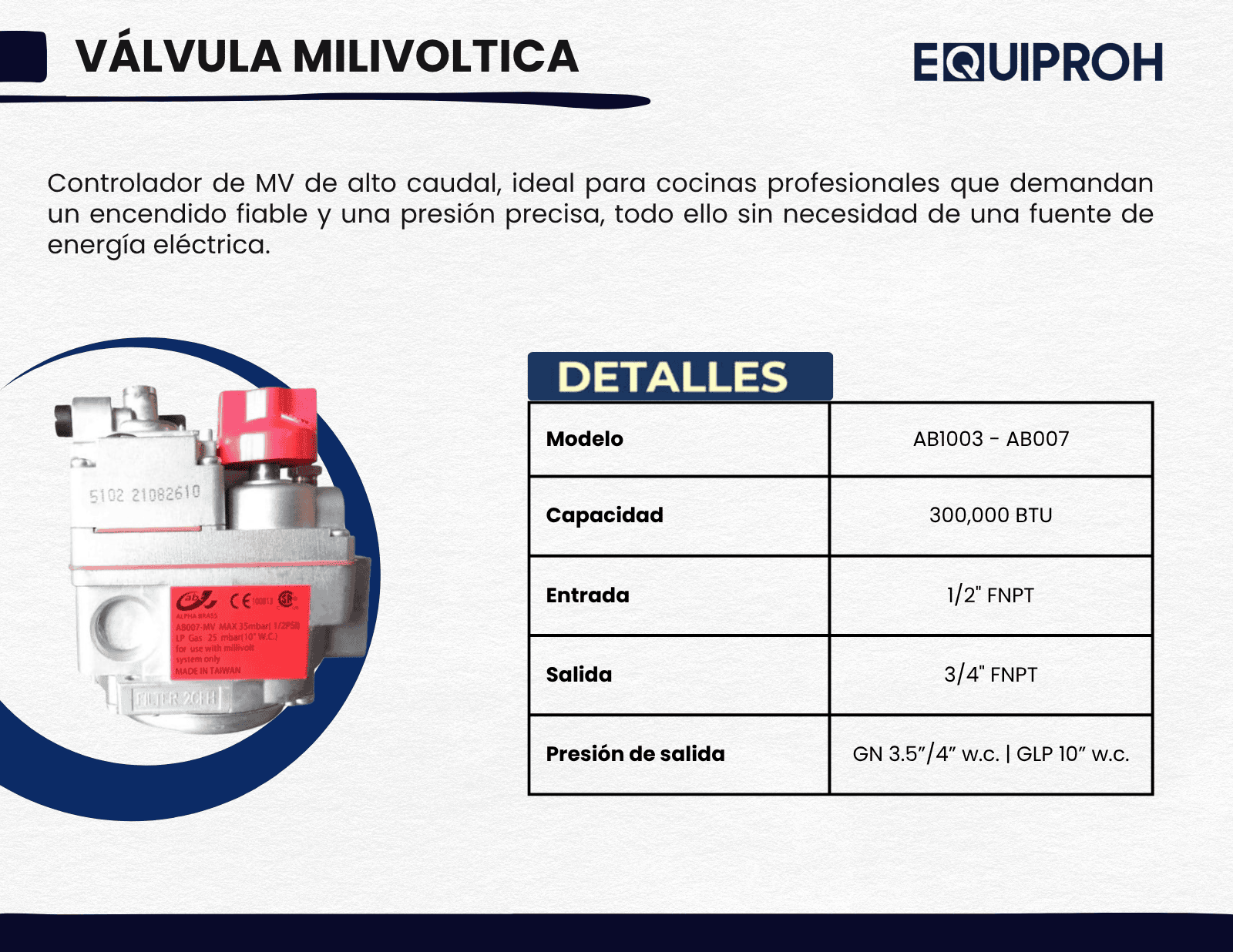 -Valvula Milivoltica Alphabrass -Control de calefacción compacto en milivoltios con altos caudales de 300.000 BTU. -Coordinado con el termostato AR, el interruptor de límite ALCC/ALCH es ideal para aplicaciones de freidora con un rendimiento confiable. -El conector de brida es opcional para un fácil montaje y mantenimiento. -Terminales NEMA estándar.